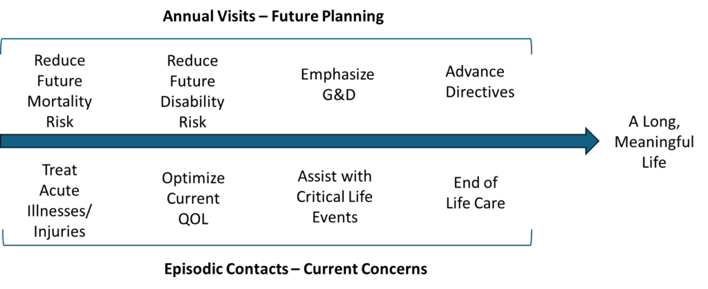 While goal-oriented care is based upon a simple concept, it is not the way most clinicians have been trained to think. It requires a mind shift. And because patients have also become accustomed to problem-oriented thinking, they too must adjust. One place to begin is to consider when each of the four goal types could best be addressed. It turns out that each goal type involves both episodic and long term planning.